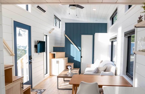 The main level has an open living space with a cozy couch and Smart TV, a dining table, a full kitchen, and a full-sized bathroom. Keeping your tiny home at a comfortable temperature is an environmentally friendly mini split AC unit and heat pump.