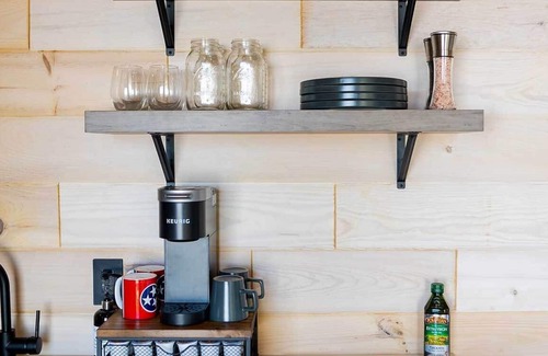 Little Rock City has a fully stocked kitchen with everything you will need during your stay including pots & pans, cooking utensils, a sink, fridge, and 2-burner range and a small toaster oven. In our tiny cabin you can cook your own meal and enjoy the sunset from the comfort of your own patio. Wake up with a cup of coffee and watch the sunrise over the ridge with the Keurig and coffee/creamer that is provided.
