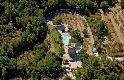 The Hawk Tower is a beautiful, ancient stone tower located 1.6 miles from the medieval town of Spoleto, and surrounded by a 12 acres private park. The villa sits on a hill overlooking a beautiful valley and facing Monte Luco, the first hermitage place of St. Francis of Assisi. Surrounded by an olive grove, the plush swimming pool with salty water is there for you to swim or to get lazy lying on a deck chair. The blue of the water melts perfectly with the ivory of the stone, the green of the olives and the violet of the lavender bush, permeating the air with its relaxing fragrance.