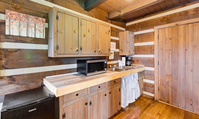 Inside the cabin, you'll find a cozy queen-size bed, a pull-out sofa for additional guests, and a large jacuzzi tub to soothe away the day's stresses. With cable TV and a thoughtfully equipped kitchen, including a stove, microwave, toaster oven, coffee pot, and a small refrigerator, you'll have everything you need for a relaxed stay in the mountains. The open layout creates a warm, inviting atmosphere that encourages you to kick back and enjoy the simple pleasures of life.