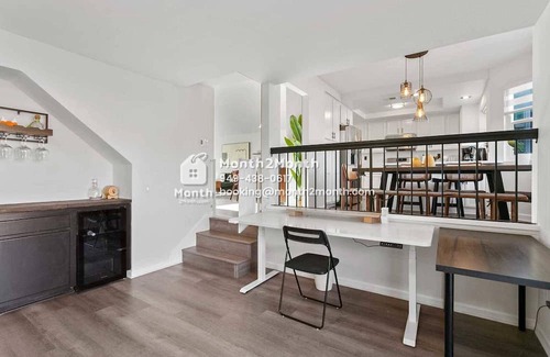 Upon entering this contemporary oasis, you'll be struck by the spacious and open layout that exudes warmth and comfort. The living area is elegantly furnished, offering a cozy haven for relaxation, featuring plush sofas and a large flat-screen TV. The dining area provides a convenient space to savor your culinary creations or takeout from the nearby vibrant culinary scene.