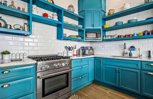 Inside, fun pops of color and comfortable furnishings adorn the light-filled living room. This space is perfect for afternoon reading sessions and late-night movie viewings. The adjacent turquoise kitchen radiantly gleams with its white-tile backsplash, stainless steel appliances, and breakfast bar.