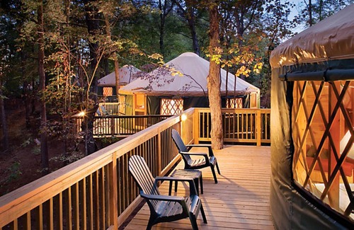 Furnishings include four-poster beds with plush linens, flat-screen TVs, elegant bathrooms and fully-equipped kitchens, all with central heat and air. Stay in an open-plan yurt with a and pullout couch. Outside, you'll also enjoy a large wooden deck area with summer kitchen.