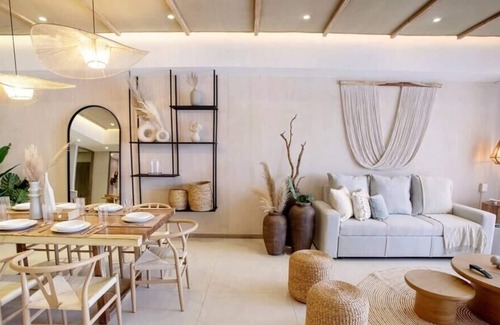 Enjoy an unforgettable stay in our Tulum-style apartment in front of Andares. Equipped with air conditioning and a safe, our 3 bedrooms are perfect for accommodating the whole family. The condominium offers a pool, gym, and 24/7 security. The master bedroom has a king-size bed, full bathroom, and SmartTV, the second bedroom has a queen-size bed and SmartTV, and the third bedroom has two twin beds. Book now and live the Tulum experience.