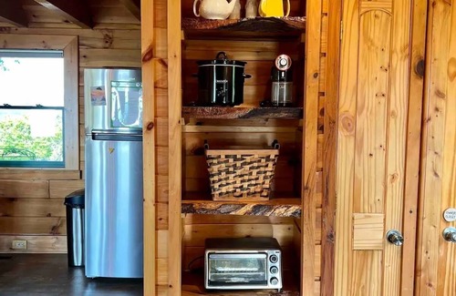 The main level has a vaulted-ceiling living room with a 32-inch smart TV ( Roku TV, Netflix and Amazon Prime). On the main floor you'll also find a sparkling newly renovated kitchen with brand new everything—cabinets, countertops, appliances, lighting, sink, faucet, etc, and so many handcrafted special touches. There’s a Keurig coffee machine and even an air fryer. There's a full bathroom with a slate-tiled standing shower. Take the spiral staircase up to the loft with two double beds and a twin bed, or take another spiral staircase down to the master bedroom. The extra-large master has a king bed, and a queen Murphy bed that folds up. There's a spacious bathroom downstairs as well with a tub/shower. Both bathrooms have brand new cabinets, sinks, faucets and light fixtures. There is a gas grill on the side deck for your convenience.