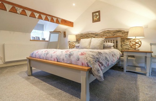 Ty Bobbet, a cottage consists of a kitchen with electric oven and hob, microwave, fridge, slimline dishwasher, kettle, and toaster, a utility with washing machine and freezer, a dining room with dining table for two, and a sitting room with smart TV, multi-fuel stove, exposed stone wall, and sofas and chairs. The bedroom is a king-size. There is a ground-floor shower room with walk-in shower, basin, heated towel rail, and WC. Outside, there is a non-enclosed front patio with furniture and off-road parking for one car. One well-behaved pet welcome. Sorry, no smoking. Shop 0.1 miles, pub 2 miles, beach 4.1 miles. WiFI, fuel, power, bed linen, and towels included in the rent. Whatever the weather, a wonderful stay awaits at Ty Bobbet. Note: There is a good housekeeping bond of 150GBP.