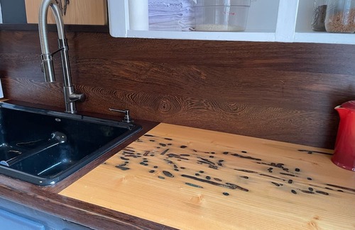 The flat has high ceilings and original fir flooring throughout. The large living room features a comfy Norwegian leather reclinable couch and red leather nest, a gas-powered fireplace for instant warmth and coziness, a big screen smart TV and a bank of windows overlooking downtown for excellent people watching and year-round sunbathing.