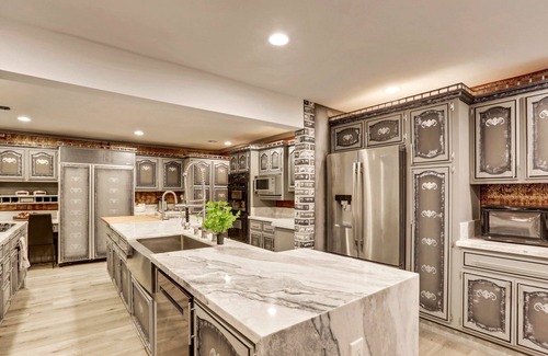 And for an ultimate happy place such as the U & U Mansion, there must be a feast every day to celebrate such a wonderful and grand vacation dwelling. The kitchen is equipped with brand-new high appliances such as a Ninja blender, Keurig, electric hot water kettle, including 3 ovens, 2 microwaves, 8 stove tops, 3 large refrigerators, and a huge kitchen island with multiple sinks. The kitchen is a full designer kitchen with more than 10 feet of islands enough to have guests mingle in the area. There are 2 dishwashers, 3 ovens and 8 stove burners in this kitchen.