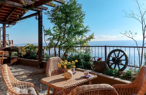 4-room house 128 m2 on 2 levels. Living room with 1 double sofabed (160 cm), satellite TV (flat screen), hi-fi system. Kitchen (dishwasher, 4 gas rings, freezer, electric coffee machine) with dining table. Exit to the terrace. Bath/WC. Upper floor: entrance hall with air conditioning. 2 rooms, each room with 1 double bed. 1 room with 2 beds. Shower/WC. No heating option. Terrace roofed. Terrace furniture, deck chairs. Panoramic view of the sea. Facilities: safe. Internet (WiFi, free). Please note: non-smoking house. Maximum 2 pets/ dogs allowed. Solar-powered energy (220 volt current, 500 W). Only solar water heating.