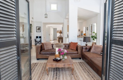 The Lounge is spacious with a lofty 5m ceiling, classy leather sofas, a dark wood glass armoire, and ducted air conditioning. Large windows flood the space with Spanish sunshine, complemented by a TV, soundbar, and a massive wood dining table perfect for meals and games. A light-filled atrium offers a relaxing spot with a sofa and recliner chair.
