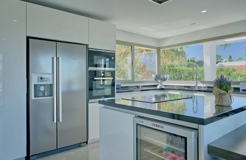 Very large, modern, luxurious villa "Eos", 3 storeys. In the district of Cansalades Park Monte Olimpo 5 km from the centre of Jávea - El Arenal, 8 km from the centre of Moraira, in a quiet, sunny position, 5 km from the sea, 5 km from the beach. Private: large, beautiful, well-kept terraced garden with lawn and wildlife garden, pond, swimming pool angular, with privacy (10 x 4 m, depth 40 - 180 cm, seasonal availability: 01.Jan. - 31.Dec.) with internal staircase. Outdoor shower, hot tub, patio, pergola, garden furniture, barbecue. In the house: central heating system, air conditioning, burglar alarm system. Roofed, parking (for 2 cars) on the premises. Supermarket 2.5 km, restaurant 1 km, bar 2.5 km, bakery 2.5 km, café 2.5 km, bus stop 5 km, sandy beach "El Arenal" 5 km, shingle beach "La Granadella" 10 km. Sports harbour 6 km, marina 6 km, golf course (9 hole) 3 km, surf school 5 km, sailing school 5 km. Please note: car recommended. The owner does not accept any youth groups. The villa has a second indoor heated swimming pool. Measurements 4x2 with exit to terrace.