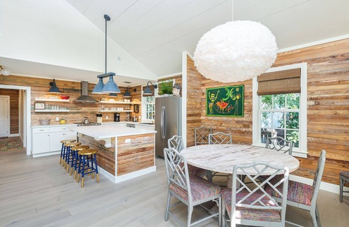 The main area on the first floor includes a grand, vaulted ceiling and a large, open concept living room/dining room and kitchen. Top of the line stainless steel appliances, white quartz counter tops and open shelving will allure your family’s chef to create sumptuous meals, even while on vacation. The kitchen is adorned with a large island with seating for four and is cleverly trimmed in historic Dade County pine. An additional dining area overlooks the back of the home and private pool via a wall of glass doors.