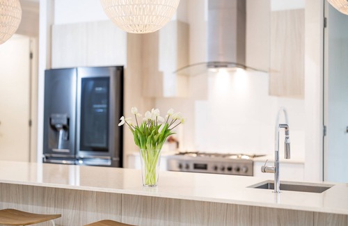 The fully equipped gourmet kitchen features premium Bosch appliances, perfect for preparing family meals.