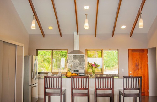 Made up of a master bedroom with king bed and en suite bathroom, two spacious bedrooms with a king bed and 2 single beds and shared bathroom this home is ideal for a group of 6 people or less. The nicest feature of this house is having the option to open the entire ocean and pool facing glass wall. The lovely cooling breeze is constant, making it a comfortable temperature throughout the day, and at night you might even wish to use a blanket! The open concept and vaulted ceiling of the kitchen and living space is also great for keeping the interior at cool temperatures so no air conditioning is ever needed.