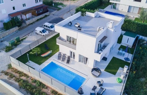 Villa Virtus is located in quiet village Karigador near Novigrad & Umag. This modern villa is equipped with high class furniture, and each room has air conditioning. It has bright & stylish living room, minimalist fully-equipped kitchen, four bedrooms and four bathrooms. In the garden you will enjoy your private pool, bbq area, and a roof terrace with gorgeous sea view, Jacuzzi and bar. Within a short distance to beaches and all the other amenities this villa is a great place for unforgettable vacation.