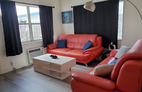 Stay in this breathtaking, impeccably furnished, clean and modern apartment where every surface glimmers. Bright and airy 1 bedroom with 1 sparkling marble bathrooms and a coin operated washer/dryer . Enjoy your very own AC throughout the apartment.