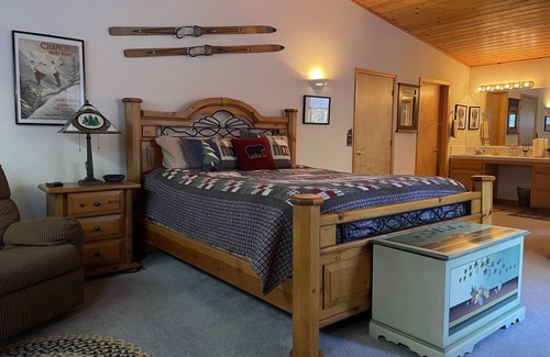 The home sleeps up to seven (5-6 adults comfortably). The large master suite has a king-size bed, comfortable recliner, flat screen television/DVD, jacuzzi bath, and private balcony. The second bedroom has a single/double bunkbed (and views of the ski hill!) The third bedroom is furnished with a queen-size bed. There is an attached two-car garage with kitchen access and a mudroom at the front entrance. Pets are NOT allowed, No Smoking please.