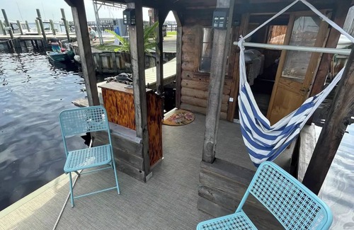 An unforgettable adventure awaits aboard our one of a kind floating tiny log cabin! Lovingly hand-made from cedar and cypress yet equipped with modern amenities like AC+heat and covered outdoor tropical bathroom. Laze the day away on the front porch chairs or swinging hammock and fall asleep to the sounds of the St. Johns River! Plus, enjoy the marina's on-site restaurant, pool bar, extra showers and restrooms while being close to historic downtown Sanford and the river walk.