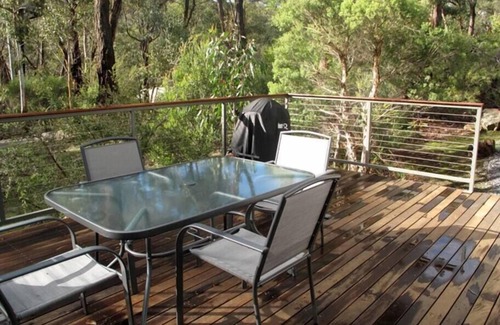 A two-bedroom cottage that sleeps four, Wattletree Cottage is great for couples or a small family. A fantastic deck and outdoor barbecue are perfect for weekend entertaining while soaking in the beautiful surrounds. Nestled in a quiet street of Halls Gap, the house is a perfect place to base your Grampians Holiday with the township and all major attractions a short drive away. A wood combustion heater (with wood supplied) makes for cosy evenings in front of the fire.