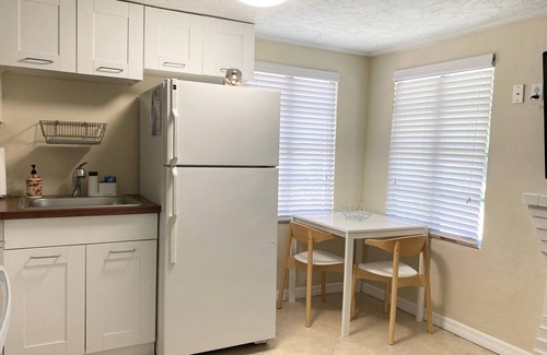 The features of this tiny house are mighty! The living room features a Queen size sleeper sofa, 50" Smart TV, cable and Wi-Fi Access, a computer desk and chair. The dining area features a small table and 2 chairs...perfect for morning breakfast. The full size kitchen is complete with a range, full size refrigerator, microwave, coffee maker and toaster. Glasses, dishware, bakeware and silverware are all on-site. The bedroom features a Queen Size bed, dresser, nightstand, closet and 42" Smart TV equipped with ROKU. The bathroom has a stand-up shower and linens and towels are provided. To round out this adorable Florida cottage, there is a shaded patio with a charcoal grill out back. Need to wash your clothes, don't worry, there is an on-site washer & dryer. Between the Queen Size bed in the Bedroom and the Queen Size Sleeper Sofa, this cottage offers sleeping for 4!