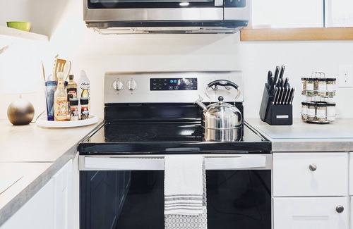 The downstairs apartment has a private front and side entrance, shared access to the gorgeous backyard, plus two private bedrooms, one-bathroom, a well-equipped kitchen and private laundry and high-end exercise equipment including a treadmill, rowing machine, and light hand weights. The space sleeps six on two queen beds and a full-size sofa bed. The entire home can sleep ten.