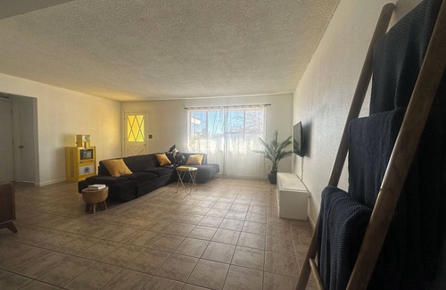 Your bnb in the heart of the mojave with pacific coast soul. A home honoring Santa Monica style in the high desert. Curated for a Mediterranean Mojave minimalist aesthetic. Nestled on a terrace, centrally located for Joshua Tree NP hiking in Black Rock and Old Town Yucca with it's famous shops, restaurants, and gateway to Pioneertown. This thoughtful retreat offers a dedicated yoga area, massage table, and other cozy amenities.