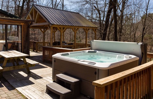 Private 2 bedroom luxury cabin located in the center of 5.5 acres of woods! The hot tub / patio area rests beside a mature pine forest that emits a delicate whisper with the slightest of wind. Relax by the gas fireplace after a day of skiing at a local resort. Soak in the private master suites' over sized tub or enjoy the therapeutic jets of the hot tub. Enjoy Direct tv on the 42' flat screen or watch a movie on the Blueray DVD player. The cabin has heat and air, a kitchen with stainless steel, microwave, range and refrigerator, a toaster, coffee maker and a beautiful butcher block to help with meal preparations.