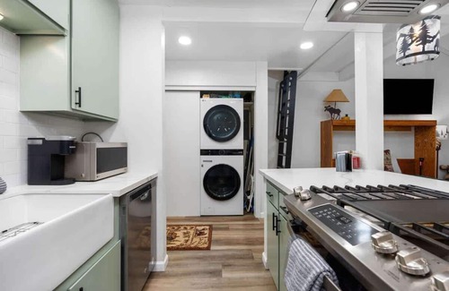 The bathroom is compact yet functional, featuring a shower and all the essentials. A washer and dryer are conveniently tucked away, perfect for refreshing your clothes after a day of outdoor adventures.