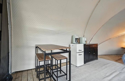 Inside the tent, you'll find a comfortable queen size bed, a mini fridge and kitchenette space, coffee maker, creating a cozy and welcoming space to unwind after a day of adventure. Whether you're traveling as a couple, with friends, or solo, this is a place to settle in, slow down, and truly reconnect.
