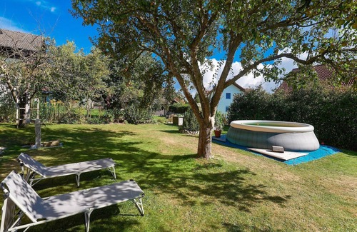 The apartment features a shared garden with deckchairs and a barbecue area, perfect for relaxing evenings. Parking and bicycle storage are available for your convenience. Public transport is nearby, and the train station is only 3 km away.