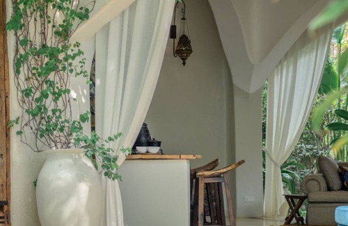 Mbingu means Heavenly Sky in Swahili. Our presidential suite, fit for a sultan and his bride. This outstanding villa gleams from the beach front, its unique domes, balconies and private pools floating over the palm trees like a mirage. This two bedroom, 4 tiered palace showcases the best of Xanadu design – spacious living areas opening out to the garden plunge pool, with direct beach access down sandy, flower-lined paths. The first floor houses a bedroom with all the Xanadu touches – a waterfall shower and en-suite bathroom, private sea view balcony, luxuriously furnished and exquisite hand-picked object d’art from Africa and abroad. Continue up the exterior staircase and the master bedroom awaits, a lofty organic domed suite that exudes space and wonder – truly reaching for the heavens. Mbingu's master bedroom has one last touch to make this a place truly worthy of the gods – a final tier to the very private, very indulgent rooftop pool, housed within a custom dome with views above the palms trees to the turquoise ocean beyond.